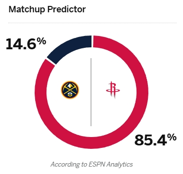 2025-03-23 23:34:33约基奇缺阵!火箭10连胜稳了?ESPN预测明日胜率:火箭高达85.4%