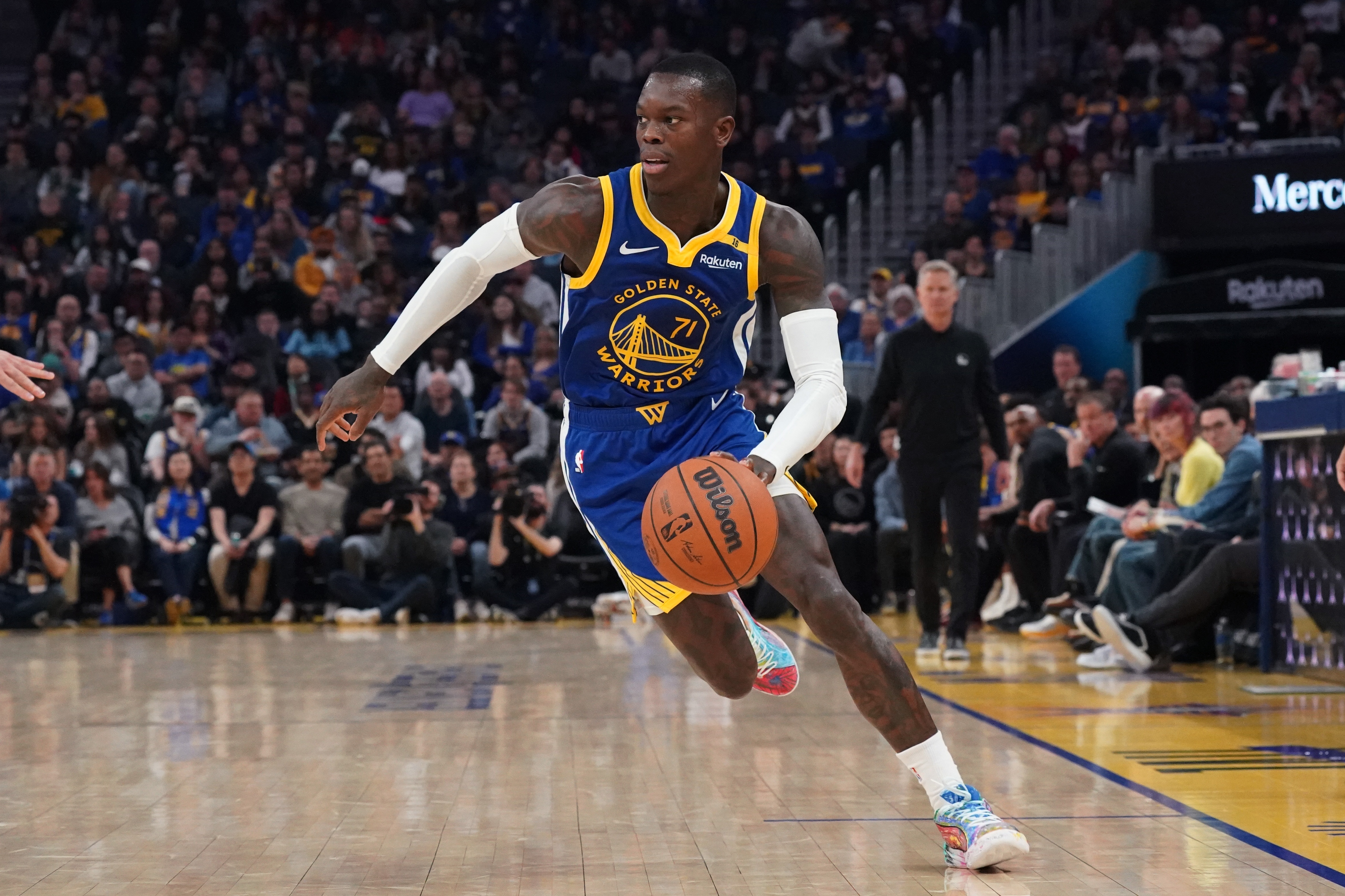 这就是勇士队在12月中旬交易来丹尼斯-施罗德的初衷:试图为已经沦为联盟倒数三分之一的进攻注入新的活力,并在一系列尝试中做出新的努力,以止住在库里离场时的失血。但是,尽管勇士队在交易后坚称一名高位挡拆组织者将是对球队的有益补充(在主教练史蒂夫-科尔的带领下,球队有时会固执地避免过度依赖篮球中最流行的战术),但施罗德并没有融入球队,他场均可以得到10.6分,三项投篮命中率分别为38%、32%和74%。根据Cleaning the Glass的数据,当施罗德在场上时,勇士队在每100个非垃圾时间的进攻回合中净负9.9分,当他在库里休息时主导进攻时,球队的得分水平仍然处于垫底。