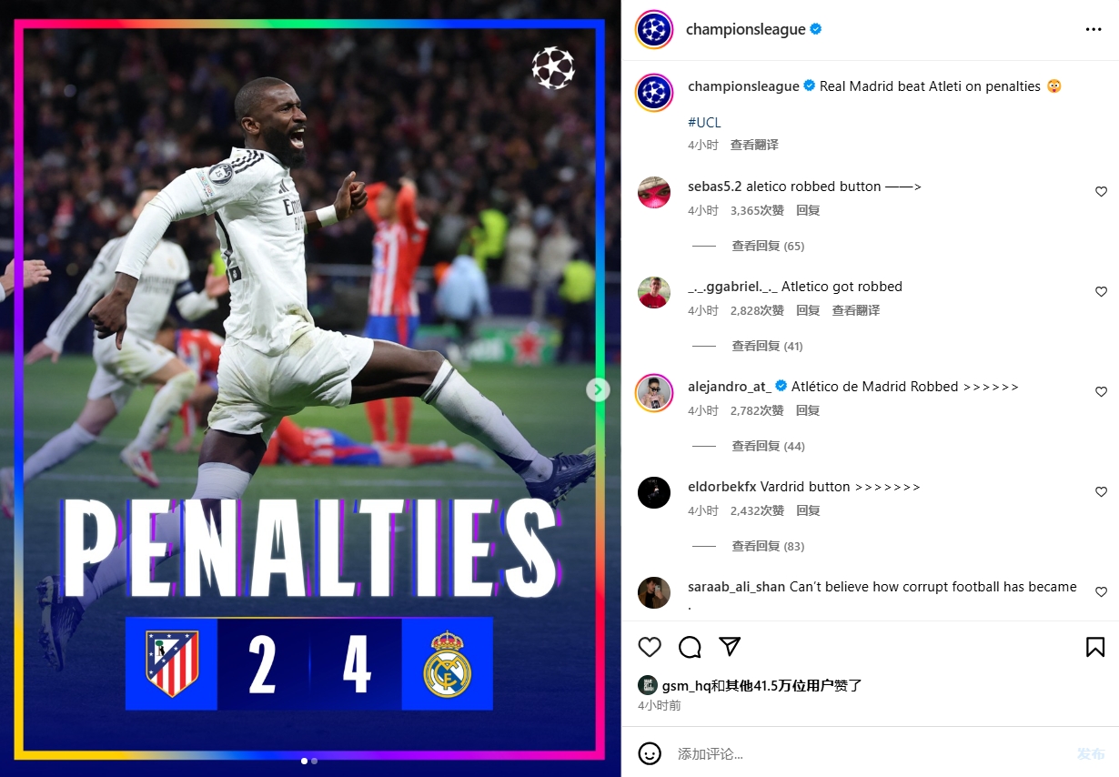2025-03-13 17:44:09欧冠官方ins评论区被刷屏:马竞被抢劫了 足球竟腐败到这个地步