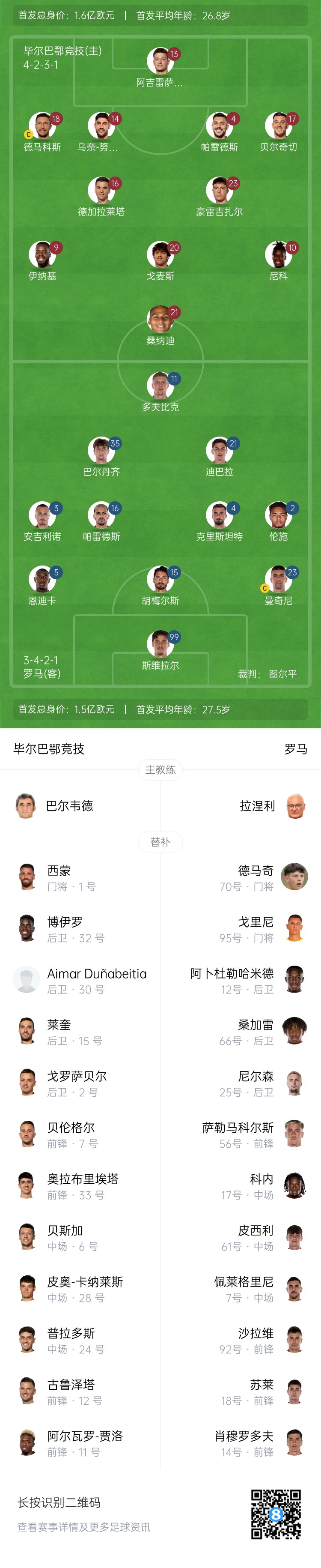 罗马首发:99-斯维拉尔、5-恩迪卡、15-胡梅尔斯、23-曼奇尼、3-安吉利诺、16-帕雷德斯、4-克里斯坦特、2-伦施、35-巴尔丹齐、21-迪巴拉、11-多夫比克