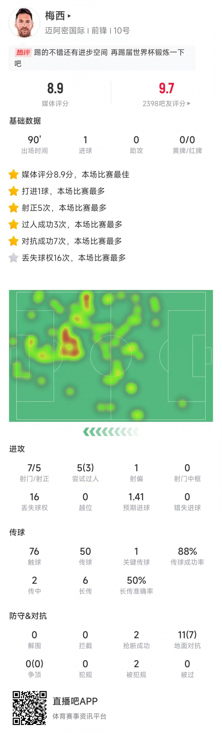 2025-03-17 11:26:00挑射破门!梅西本场数据:7次射门5次射正,获评8.9分全场最高