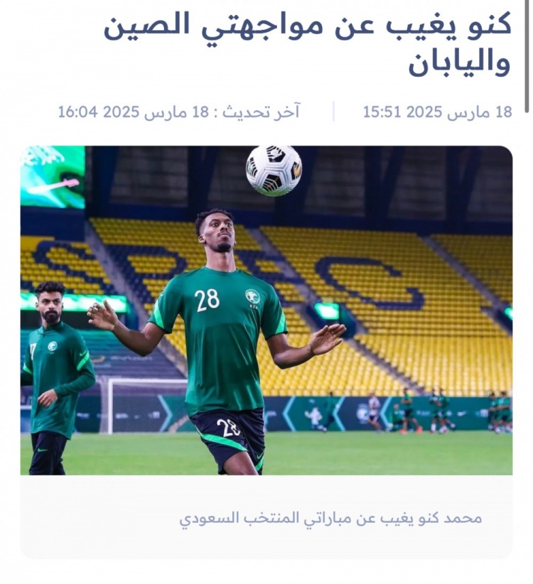 【相关】沙特媒体:沙特国脚中场穆罕默德-卡努因伤缺席对阵中国、日本