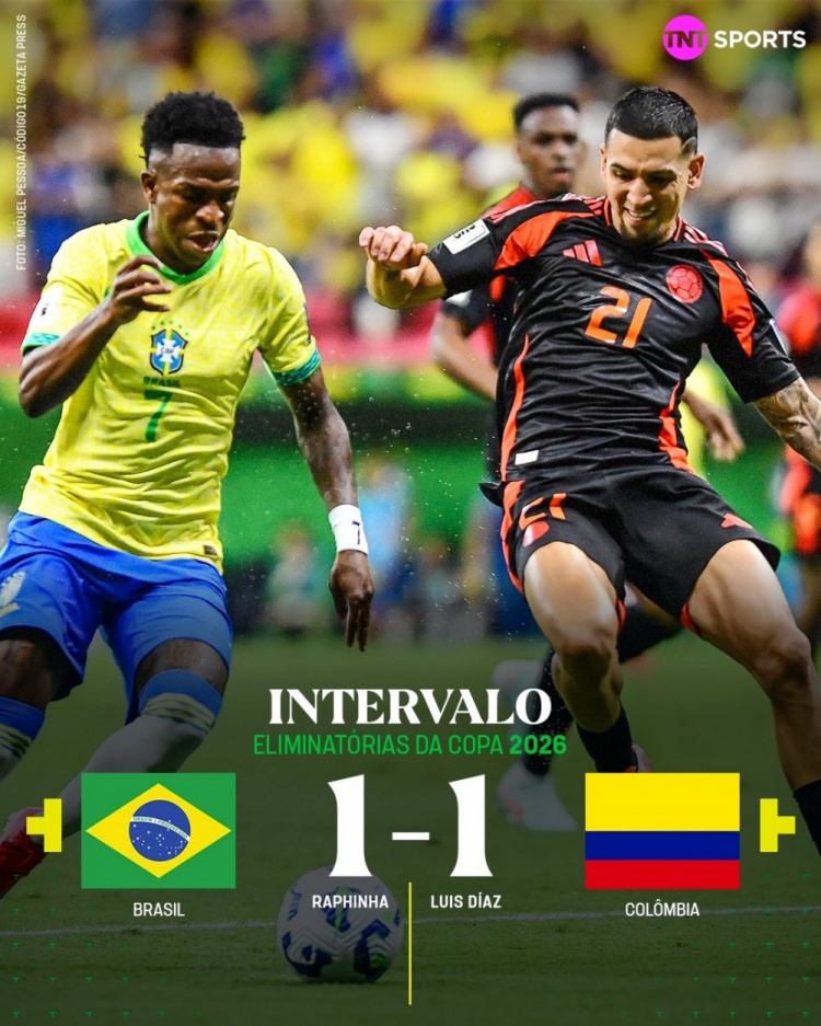 2025-03-21 12:38:00半场-拉菲尼亚点射维尼修斯造点迪亚斯扳平 巴西1-1哥伦比亚