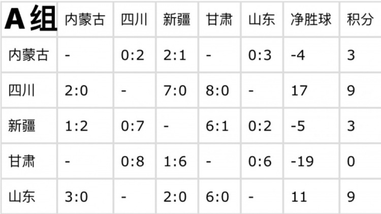 目前,四川和山东同积9分,凭借出色的表现已提前锁定出线资格。在净胜球方面,四川以17个净胜球领先,山东净胜球为11个。内蒙古和新疆均积3分,甘肃积0分已确定无缘出线。最后一轮比赛,虽无直接影响出线的关键对决,但各队仍会为荣誉而战,力求以更好的成绩结束资格赛阶段。